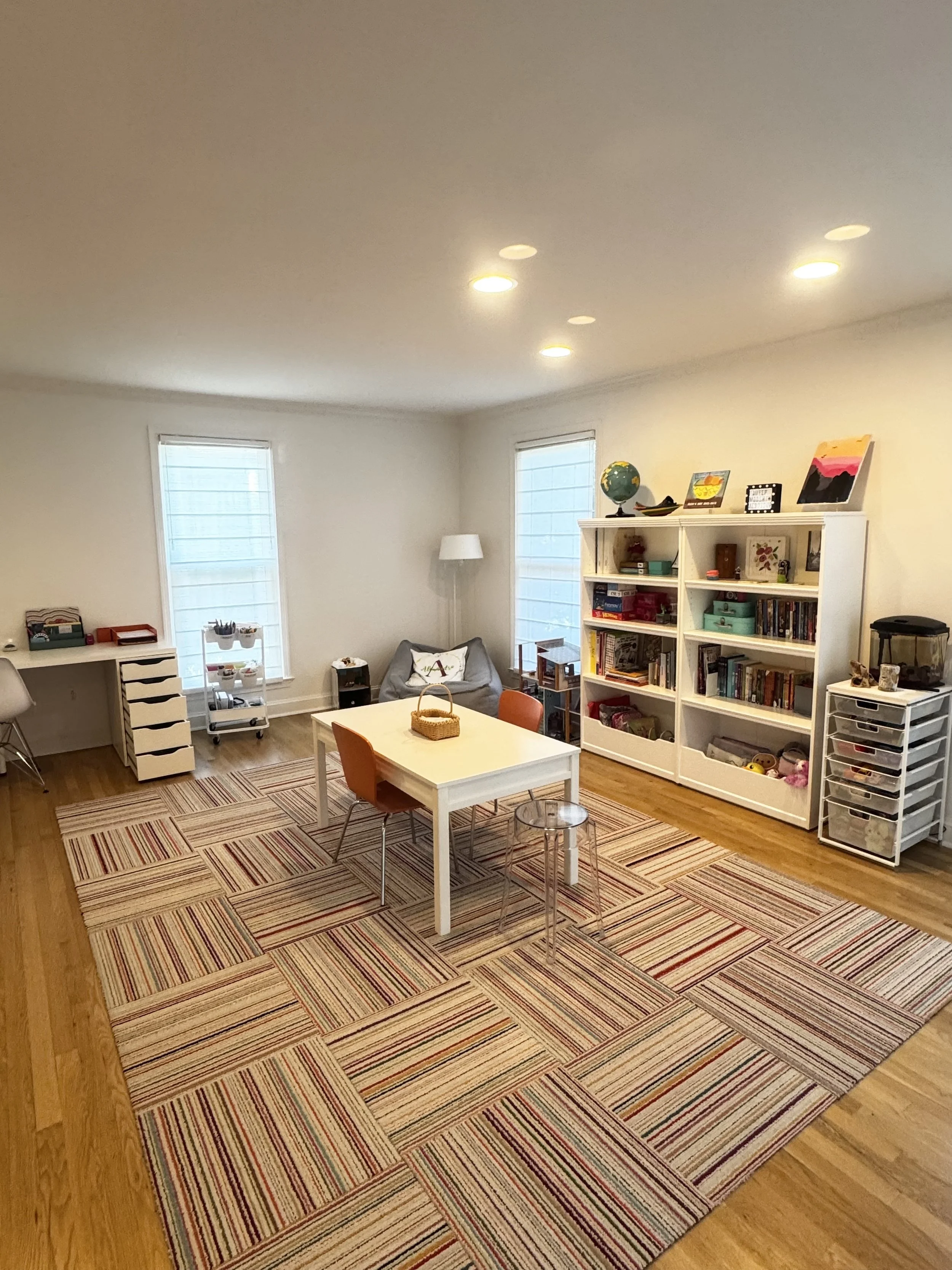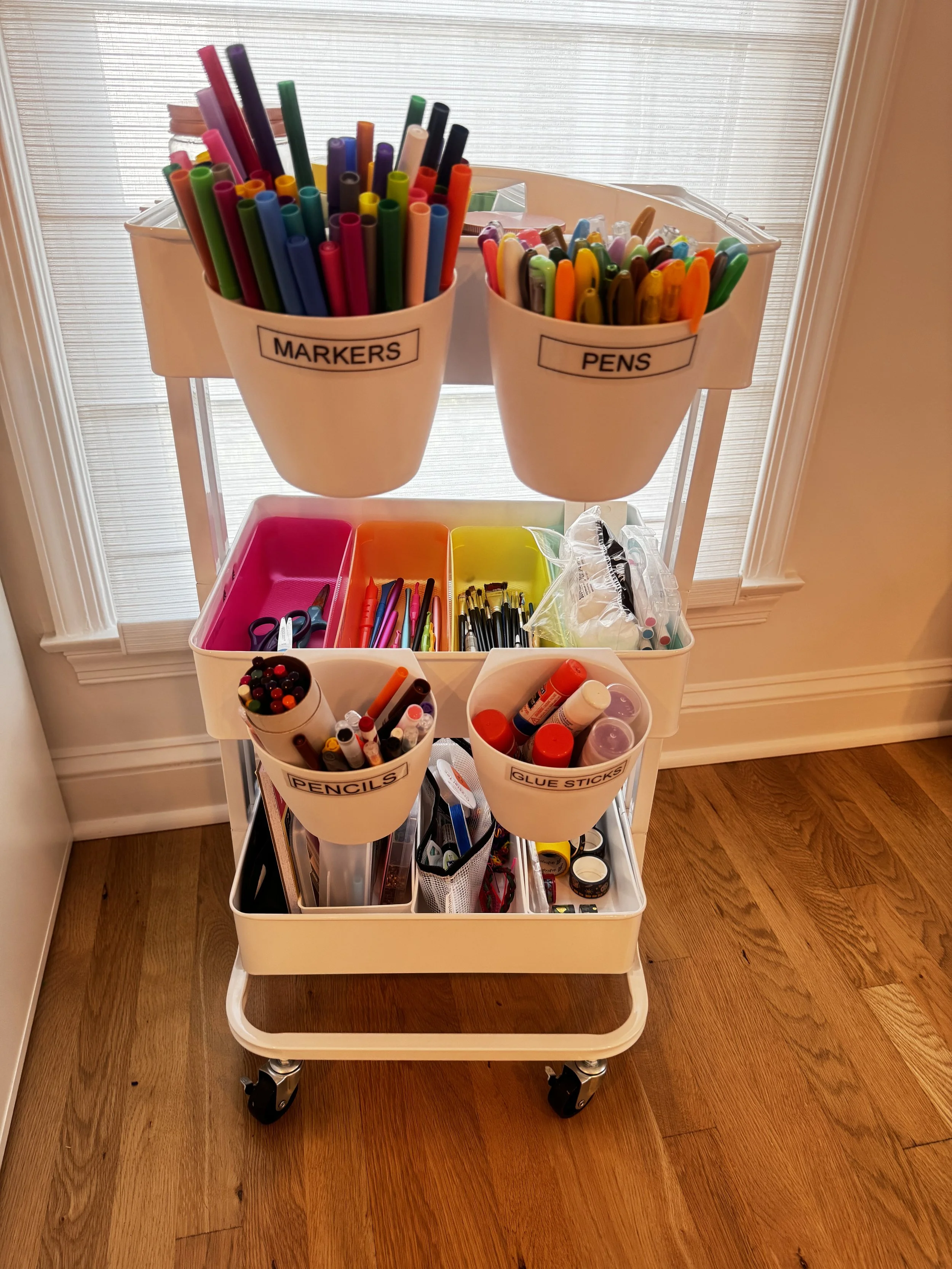 Next up, we were invited back by that same client to organize her kids’ playroom. We created zones for each child’s needs, categorized toys and learning tools, and introduced one of our favorite functional pieces, a 3-tier rolling art cart from The Container Store, perfect for keeping craft supplies organized and mobile.