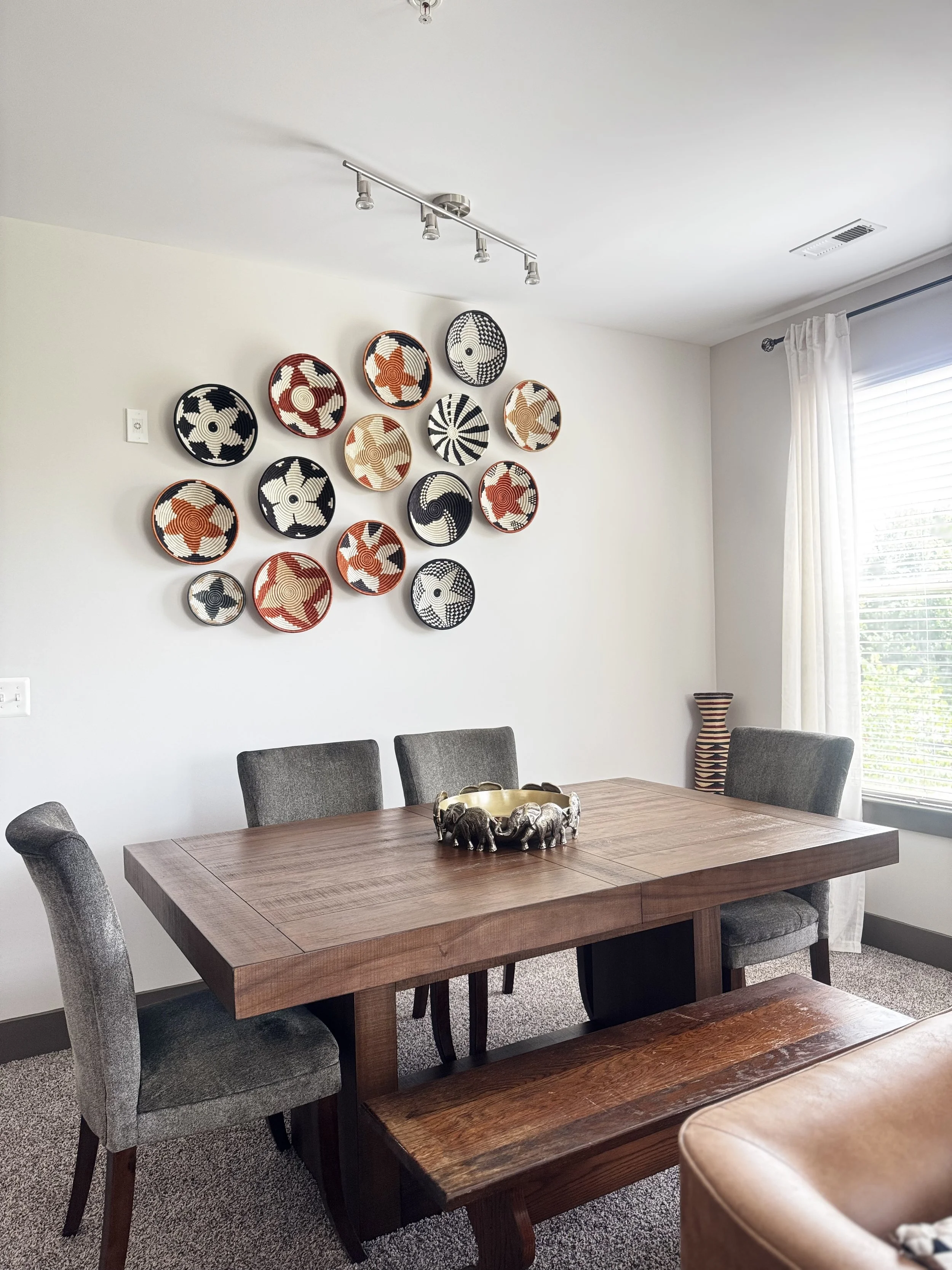 A beautiful dining space with cultural decorative accent baskets from Rwanda adorning a wall and we added a beautiful elephant brass bowl as a center piece which can also be used as a fruit bowl.