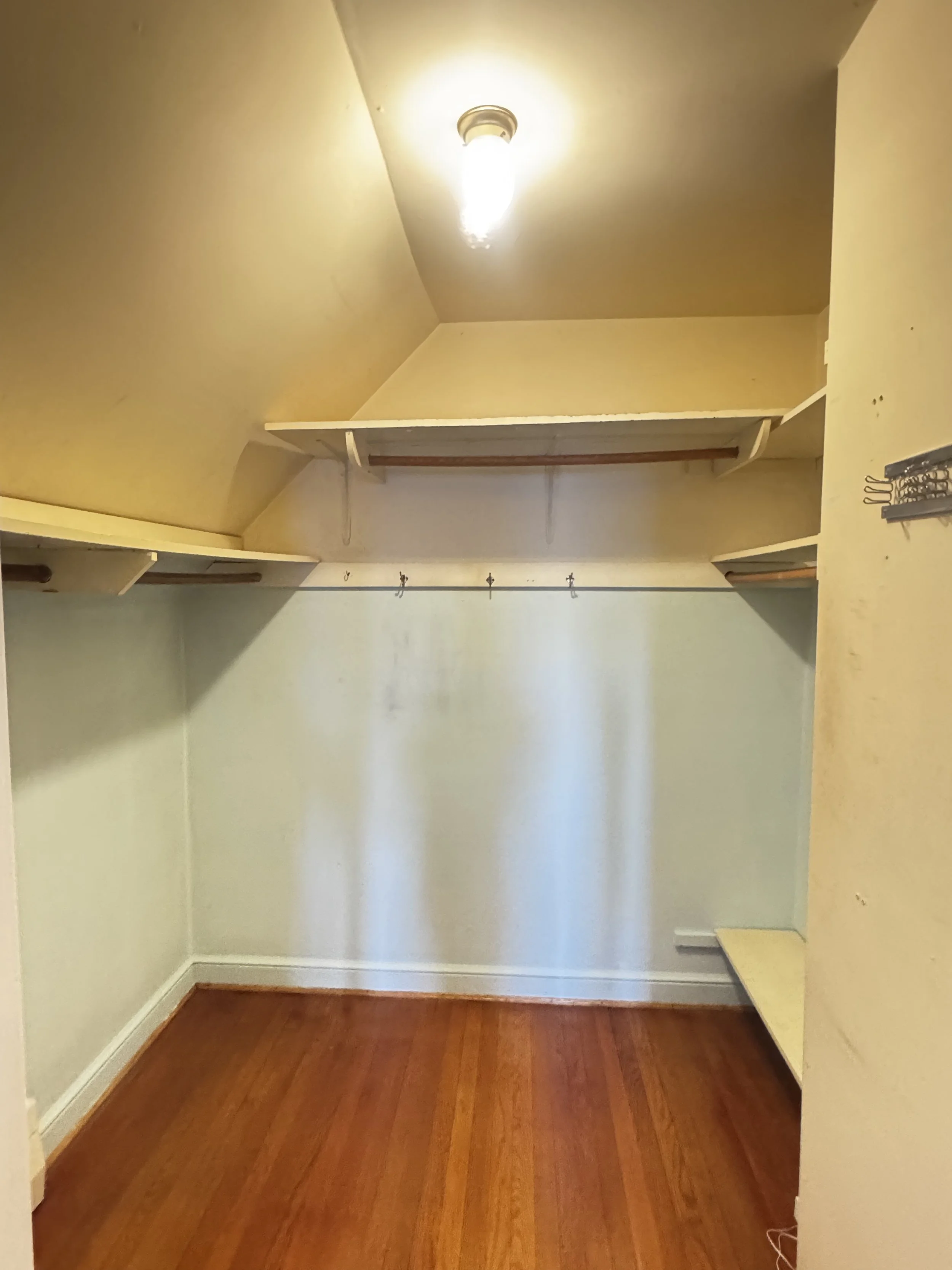 Primary closet before, outdated and not functional for two people to share.