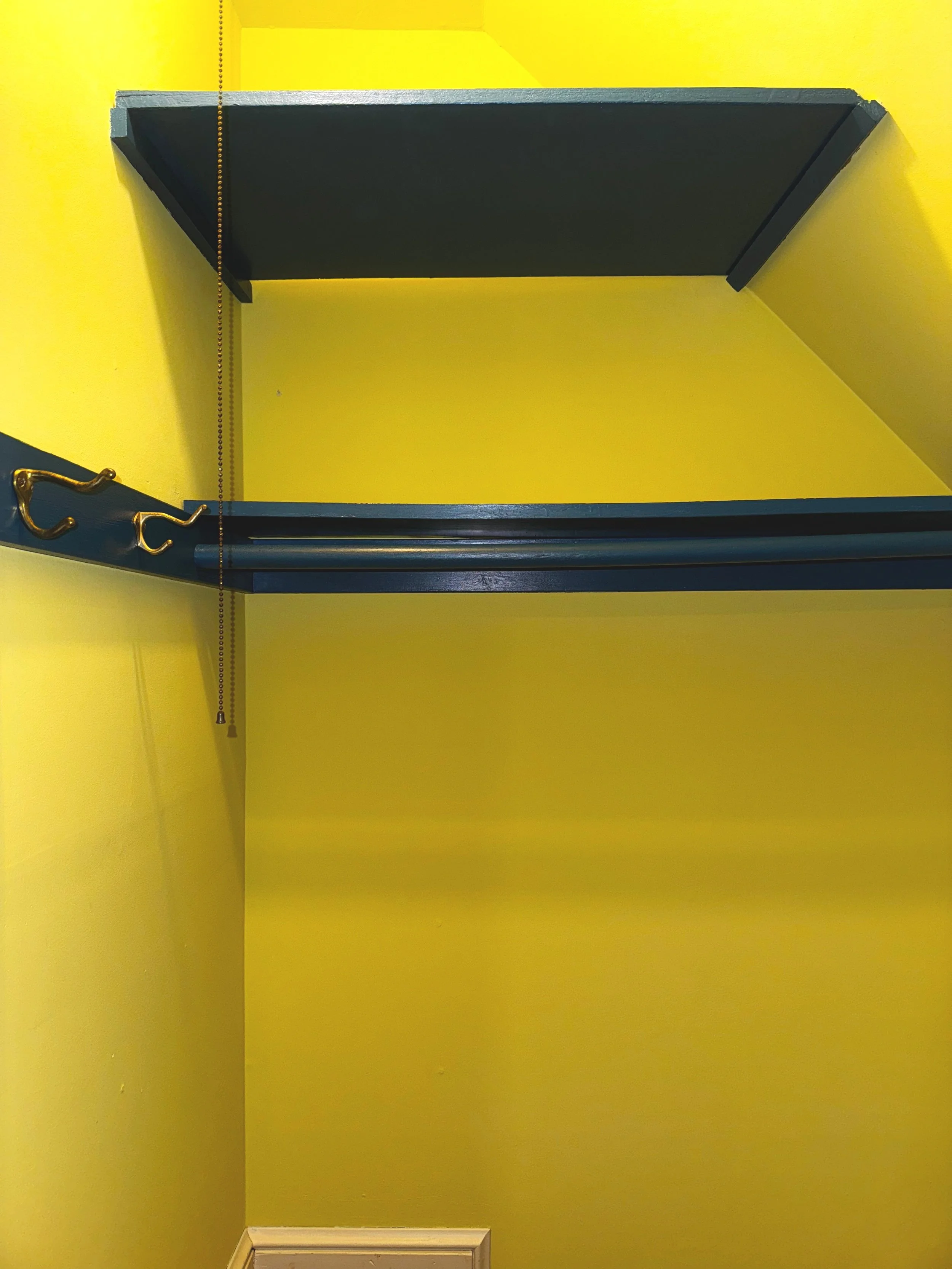 • The same deep blue from his bedroom, used on the shelves and hanging rod.