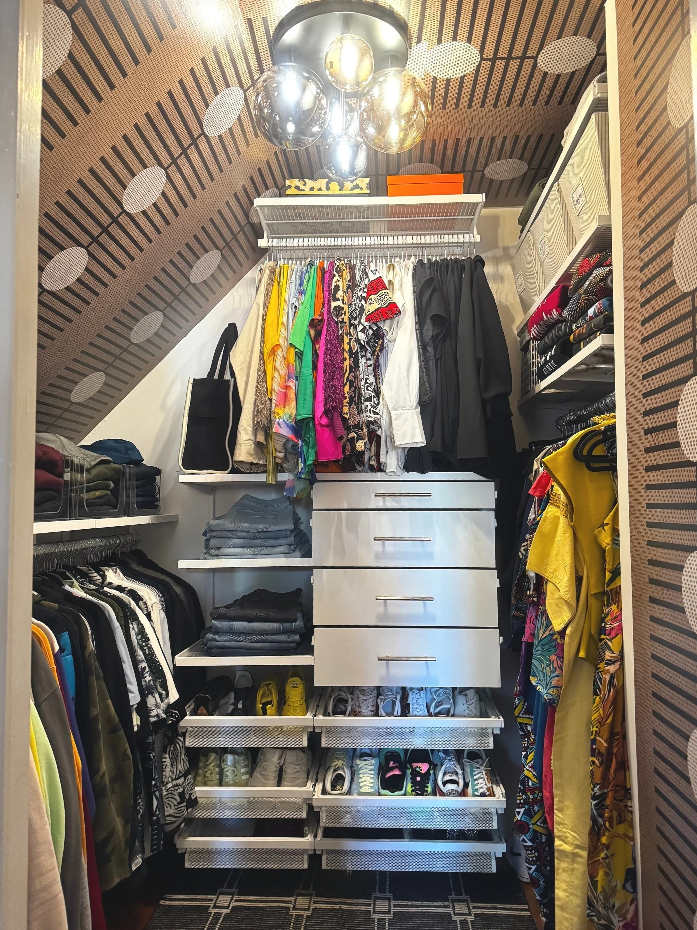 To bring in warmth, texture, and a stylist’s touch, I styled the closet with "Nomalanga" wallpaper by one of my favorite brands, Mitchell Black. This bold yet elegant print completely elevated the space. I also swapped out the old, dated light fixture and installed a statement showstopper—a ceiling light that not only brightens the room but ties perfectly into the wallpaper’s mood and color palette.